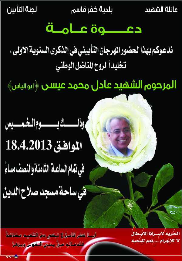 دعوة عامه لاهالي كفر قاسم والمنطقه لحضور مهرجان الذكرى السنويه الاولى لاستشهاد المناضل عادل محمد عيسى