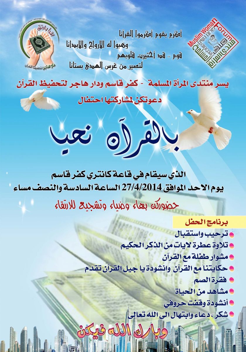دعوة عامة : يسر منتدى المراة - كفرقاسم ودار هاجر لتحفيظ القران دعوتكن لمشاركتهن في احتفال : بالقران نحيا
