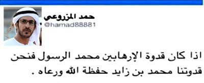 قال العقيد الاماراتي حمد المزروعي الساعد الايمن لوزير الاعلام في الامارات والمسئول عن تلفزيون ابو ظبي قال ان قدوته في الحياة محمد بن زايد وليس محمد رسول الله … وقال ان محمد الرسول قدوة للارهابيين